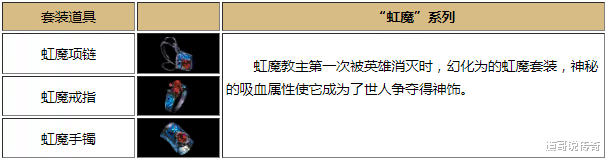 虹魔手镯和虹魔戒指以及虹魔项链搭配成虹魔套装,这个特殊套装是封魔谷开放的时候出现的全新套装,每件装备都有吸雪效果,套装搭配起来吸雪比例大大增加。不过官方介绍没有标明吸雪数值或者比例,只有在一些非官服版本中才有明确。